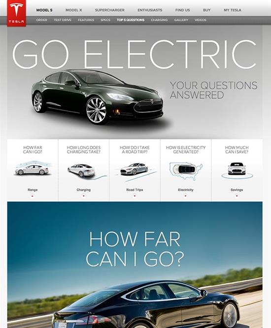 9. 交互式故事 你想把所有的內(nèi)容聚在一起嗎?假如你的品牌由一系列概念或價值(優(yōu)雅、創(chuàng)造力,簡約等),從頁面布局到字體選擇,你都能通過頁面元素和交互性故事來闡述品牌和理念。如特斯拉的官網(wǎng)。