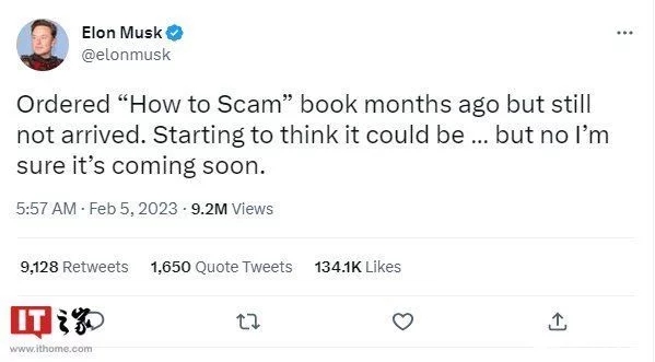 馬斯克發(fā)今日推文稱:“在幾個(gè)月前訂購了一本叫做《怎么欺詐》的書,但還沒到,開始覺得它可能是... 不,我相信它很快就會(huì)到了。”