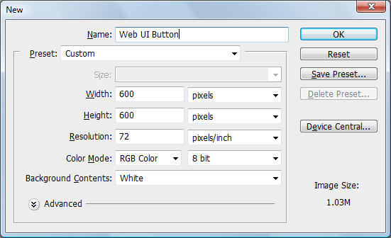 第1步:創(chuàng)立Photoshop文檔 該按鈕大。▽抶長(zhǎng))170像素x50像素。我們的畫布大一點(diǎn),比如設(shè)為600像素x600像素